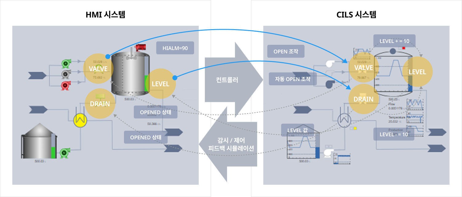 산업용 제어 시스템(ICSIndustrial Control System ,HMI/SCADA)의 단말 시스템에서 운전자 조작에 대한 제어 피드백을 시뮬레이션(CILSControl-In-the-Loop Simulation) 하기 위한 솔루션으로 운전자 훈련을 위한 시나리오 개발 및 제어 피드백을 정의합니다.